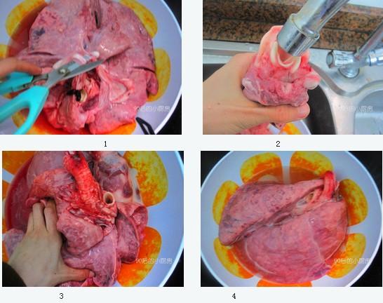 1、第一步拍打和擠壓豬肺的過程重復(fù)兩到三次就可以了,可以不用洗到發(fā)白,因為還有后面的兩步處理完全可以將豬肺處理干凈。