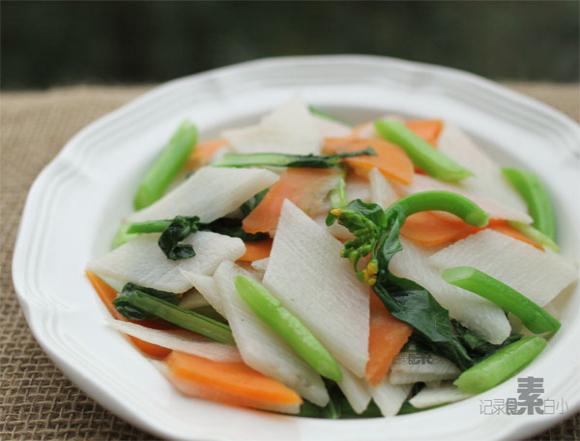 3.重新起鍋下少許油,下?tīng)C好的蔬菜加1/2小匙鹽大火快速炒勻出鍋即可。