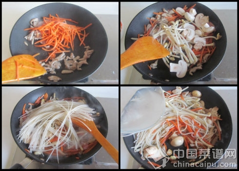 5. 肉絲煸炒變色后下入紅蘿卜絲翻炒;
