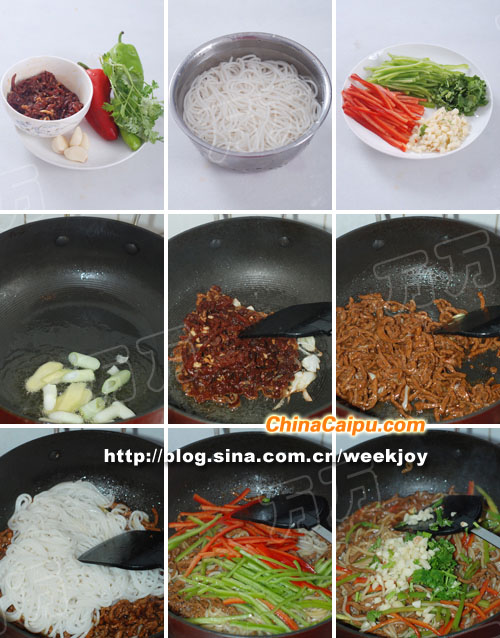 3.倒入瀝去水分的米粉,與肉翻炒均勻,加入青紅椒絲繼續(xù)翻炒,出鍋前加入蒜和香菜,可以根據(jù)口味再加入少許鹽。