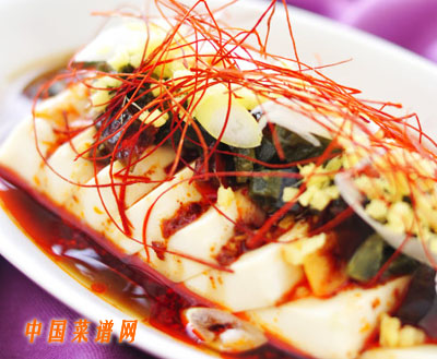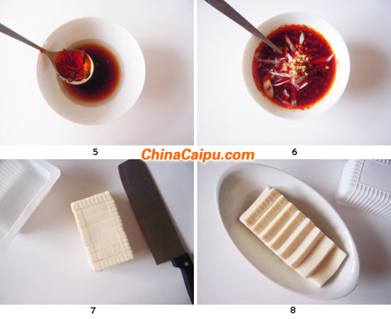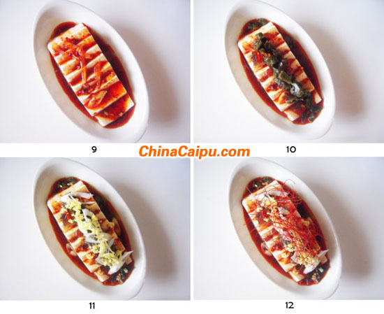 9.在豆腐上撒上步驟6里準(zhǔn)備好的紅油涼拌汁。