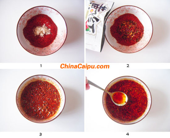 3.鍋中燒熱油,分兩次澆在調(diào)料上。
