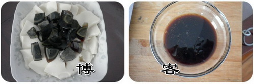 3,將皮蛋丁撒在豆腐上,將生抽,醋,香油調(diào)成調(diào)料淋之即可。