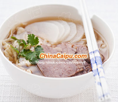 9、最后將煮好的面放入牛肉湯里,放上醬牛肉,蘿卜,香菜即可。