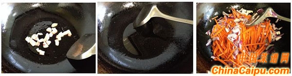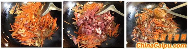 2、起鍋坐油,先放牛肉的肥肉部分,小火熬出牛油后,油渣撈出不要,下胡蘿卜和洋蔥翻炒。