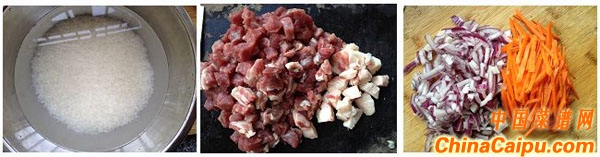 1、大米洗凈浸泡約1小時,牛肉切粒,