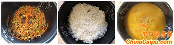 ???? ? 3、最后做飯的時候一定要注意水量,米是泡過的,而且蔬菜本身也會出水,所以加水量一定要比平時煮飯少。