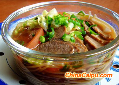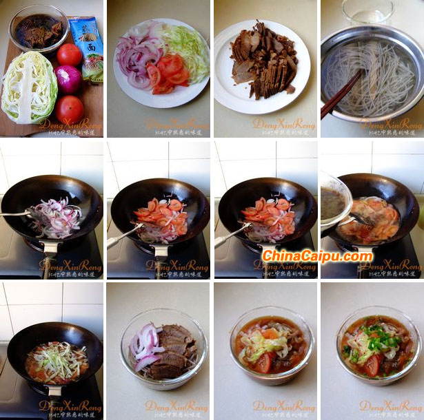 7、面條上碼上醬牛肉片和洋蔥絲;