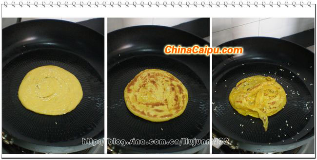 平底鍋用小火加熱,再刷上少許的油,下入餅胚,小火將其烙黃一面后翻面,最后烙至兩面金黃熟透后用筷子將其趁熱掀松即可。