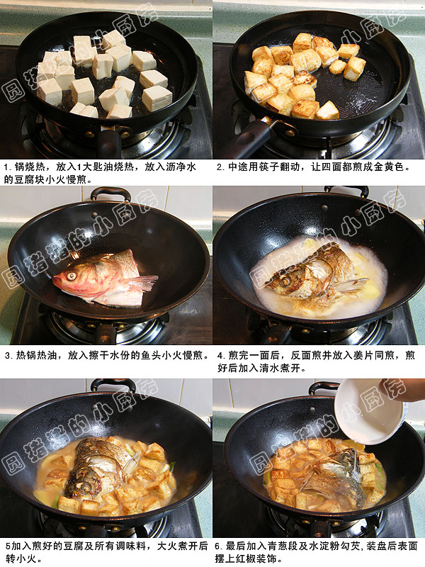 準(zhǔn)備工作:魚(yú)頭先用料酒,細(xì)鹽涂抹腌制10分鐘。豆腐切小方塊、大蒜用刀拍裂、香蔥切段、姜切片、