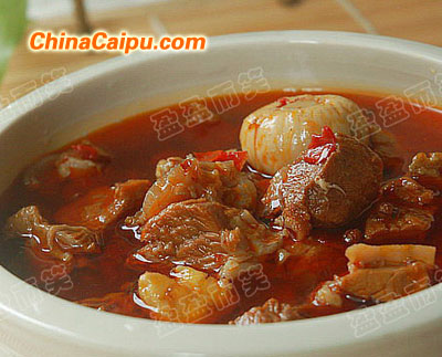 6、加入煮牛肉的清湯,適量鹽,入高壓鍋40分鐘左右,最后再加適量雞粉調(diào)味即可。