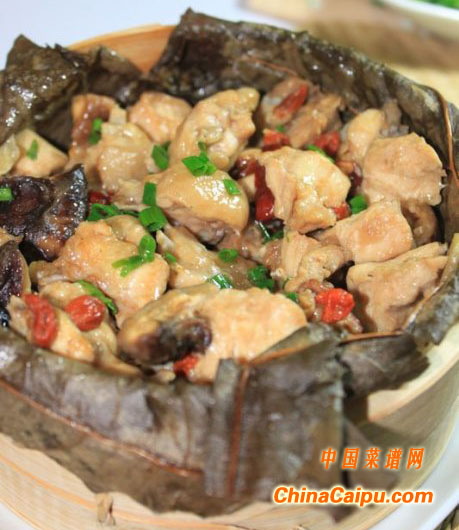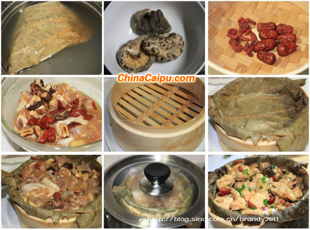 材料 鮮雞半斤,荷葉一張,大朵冬菇四朵,紅棗枸杞子隔一小撮,鹽,