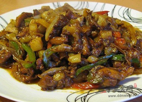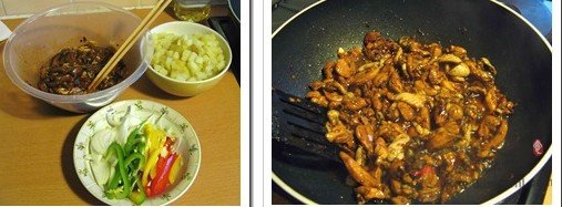 5、下入雞丁、洋蔥絲和圓椒絲,將鍋中