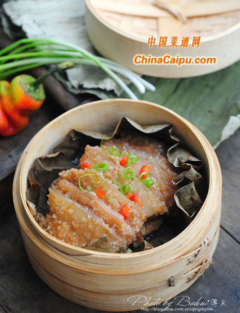 5、將蒸肉米粉加入五花肉中,再加適量清水?dāng)嚢?,讓肉均勻的裹上米粉?br data-MpRn="acCTT0">6、蒸籠里鋪上荷葉,將肉擺放上去,或者直接擺放在盤(pán)中。