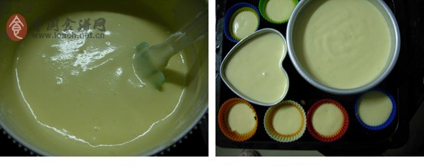 7、將混合好的蛋糕糊倒入模具,抹平,用手端住模具在桌上用力震兩下,把內(nèi)部的大氣泡震出來??鞠湟欢ㄒA(yù)熱,放入預(yù)熱145度的烤箱,45分鐘即可??竞煤蟮牡案鈴目鞠淅锶〕鰜恚⒓吹箍墼诶鋮s架上直到冷卻,然后脫模。