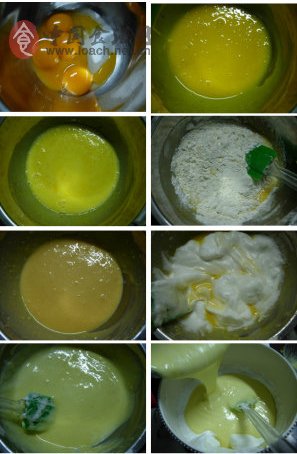 6、盛1/3蛋白到蛋黃糊中。用橡皮刮刀輕輕翻拌均勻(從底部往上翻拌,不要劃圈攪拌,以免蛋白消泡)。翻拌均勻后,把蛋黃糊全部倒入盛蛋白的盆中,用同樣的手法翻拌均勻,直到蛋白和蛋黃糊充分混合。