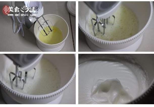 2、先打發(fā)蛋白,蛋黃放一邊備用。用打蛋器把蛋白打到呈魚眼泡狀的時候,加入1/3的細(xì)砂糖(20克),繼續(xù)攪打到蛋白開始變濃稠,呈較細(xì)膩泡沫時,再加入1/3糖。到蛋白比較濃稠,表面出現(xiàn)紋路的時候,加入剩下的1/3糖。