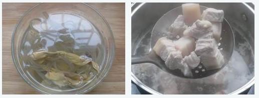 2. 將切好的五花肉放入沸水中汆燙1分鐘后撈出瀝干水;