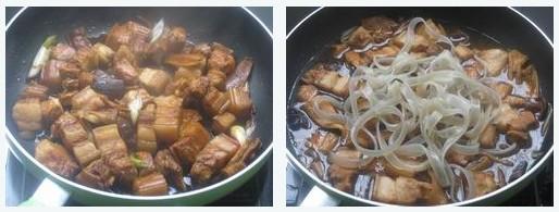 5.放入泡軟的粉條和鹽,攪勻后蓋上鍋蓋繼續(xù)用小火煮5分鐘至粉條軟爛即可。