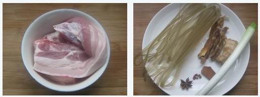 1、將粉條和筍干用溫水泡軟,把五花肉切成小塊,大蔥切段,姜去切片備用;