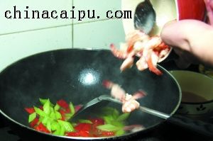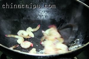 5 倒入炒好的蝦仁快速兜勻。