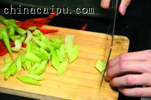 2 鮮百合取瓣洗凈,瀝干水待用;西芹撕去老筋,斜切成段,紅椒切成菱形片。