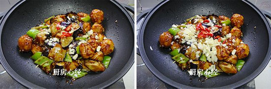 7.留一半的蒜末;紅美人椒切片備用。鍋中先爆香尖椒片,然后倒入碗汁,待碗汁濃稠,倒入炸好的土豆丸子;茄子