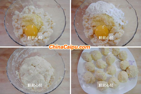 05.土豆:土豆是最不容易炸透的,所以先把土豆蒸熟,做成土豆丸子,再炸就容易熟了。