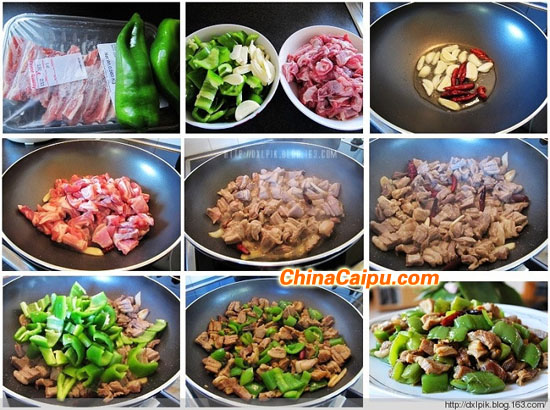 5、入青辣椒,大火翻炒至斷生,入生抽、鹽拌勻,即可。
