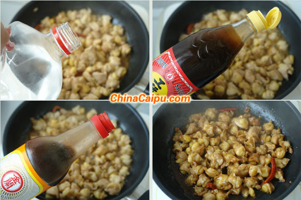 2.雞脆骨微微變焦后加入50ml的白酒轉(zhuǎn)大火燒3分鐘后,加入一勺烏醋,一大勺醬油膏繼續(xù)翻炒至湯汁濃郁。
