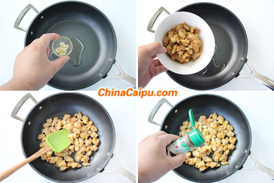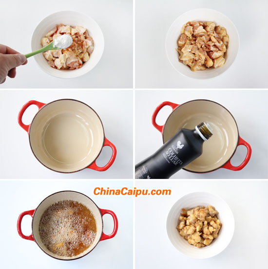 2.腌制好的雞脆骨加入少許淀粉拌勻,鍋中倒入適量的植物油燒至180度左右,加入雞脆骨炸至金黃色后撈出備用。