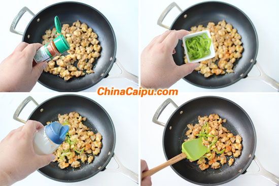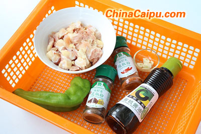 3.炒鍋中加入少量的油,放入蒜片爆香后倒入炸好的雞脆骨翻炒,加入辣椒粉,花椒粉調(diào)味,出鍋前加入青椒絲與少許鹽巴即可出鍋。