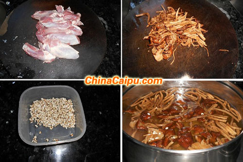 2. 茶樹(shù)菇用水泡發(fā),去根蒂,切段。