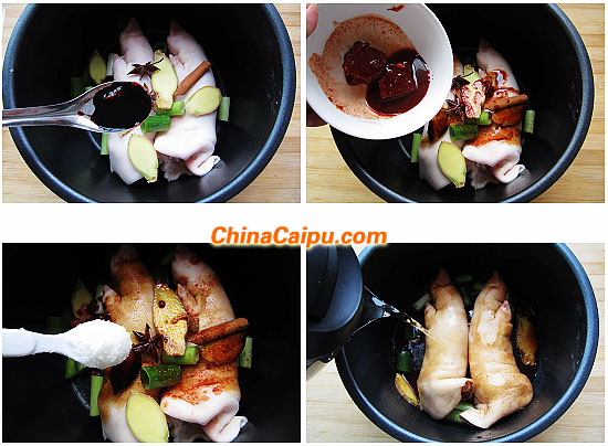 原料:豬蹄2只、腐乳1塊、蔥姜、八角2個、桂皮1塊、白醋1大勺、白酒2小勺、白糖2小勺、