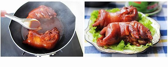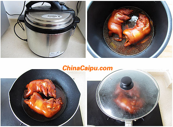 4、高壓鍋加蓋開火燉煮1小時候,將燉好的豬蹄和湯汁一起放入炒鍋中,繼續(xù)燉煮15分鐘,并不斷將湯汁淋在豬蹄上,最后湯汁收緊即可出鍋