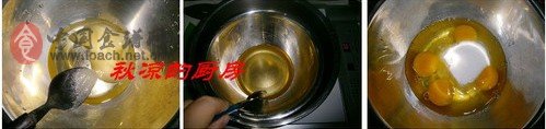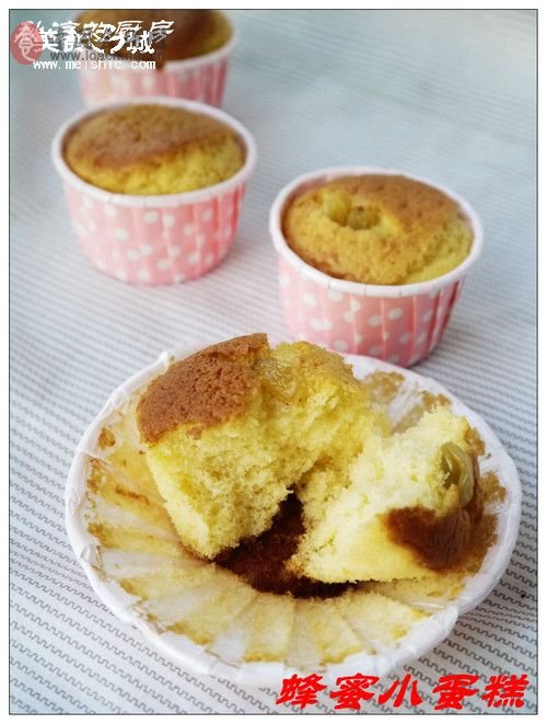 材料:玉米油40克,蜂蜜60克,全蛋4個,細砂糖40克,低粉100克,泡打粉1/2小匙
