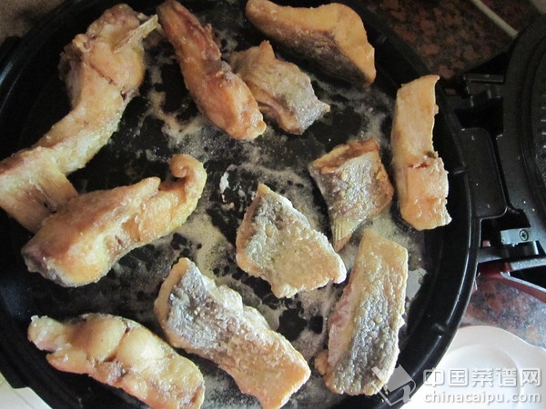 3.不粘鍋放入適量油,把魚(yú)塊煎至表面金面后取出待用
