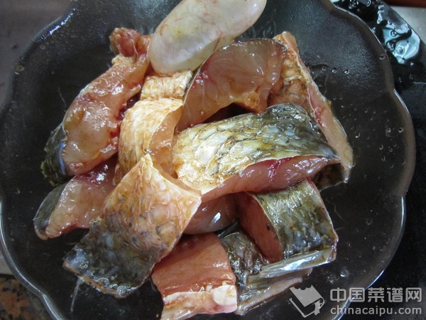 1.把魚(yú)斬大塊,洗去血水后控干水,放入適量料酒及輔料中調(diào)味料抓勻,放冰箱腌制1小時(shí)
