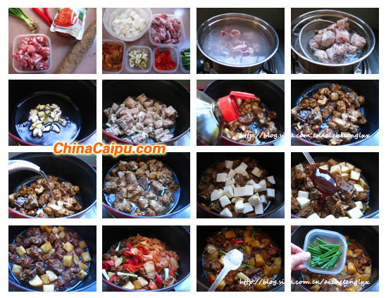 原料:泡菜130克、山藥230克、排骨450克、紅辣椒2支、蔥3支、大蒜4瓣、姜三大片,叉燒醬2大勺、老抽1小勺、鹽適量
