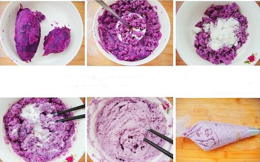 1、紫薯兩個約200g,蒸熟去皮,放一大碗中用壓土豆泥的工具碾成泥,加入20g細砂糖,50g奶油,用電動打蛋器以低速攪打至順滑;