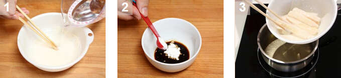 3. 在另一個碗中將醬油,糖,醋和生粉混合。