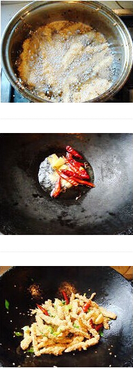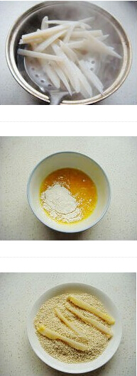 4. 取小點的鍋入油燒五六成熱,依次下入藕條炸成金黃色。將炸好的藕條瀝油撈出。