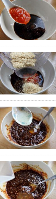 自制燒烤醬的材料:花生仁15克,白芝麻5克,黃豆醬1小勺,老抽1湯勺,生抽1湯勺,食物油1湯勺,精鹽1/2小勺,番茄醬1湯勺,五香粉1/3小勺,孜然粉1/4小勺,糖2小勺,生姜粉1/4小勺,水