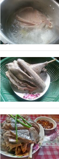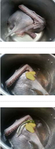白切鵝的做法: 1.鵝收拾好,放鍋里, 2.加適量清水,加鹽片, 3.下蔥段,