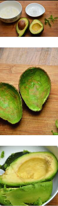 1.牛油果對半切開果肉挖盡,殼子待作為容器。