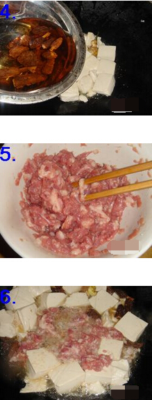 4 豆腐燒開之后把調(diào)好味的豬肉放下去一起煮,用筷子搞散豬肉,大火煮到豬肉熟透,汁水收干就裝盤待用。
