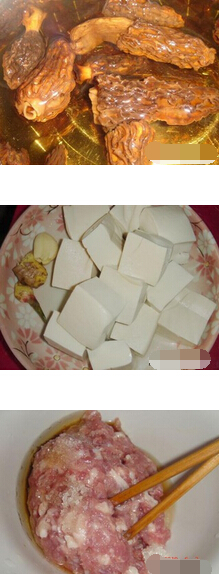 1 羊肚菌先用冷水炮一下,洗去泥沙,豆腐切小塊,一塊切成四小塊,豬肉絞碎放鹽,糖,油,酒調(diào)味。
