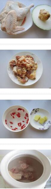 冬瓜燉土雞的材料:冬瓜300克,土雞半只,鹽,枸杞30個,姜5克,料酒2 茶勺,