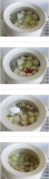 3. 把冬瓜去皮去籽洗凈切大塊,加入煲里,再加枸杞大火燒開,轉(zhuǎn)小火燉10分鐘左右,加鹽再燉幾分鐘冬瓜熟透即可盛出享用