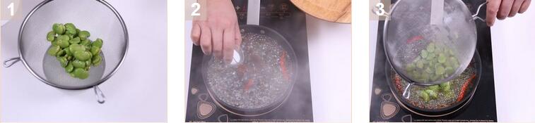 茴香蠶豆的材料:蠶豆500克,八角1枚,花椒1克,干辣椒3支,桂皮1小段,鹽1茶匙(5g)水1000ml